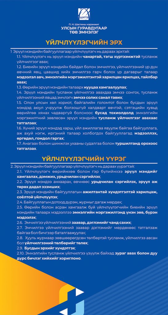• 2.5. Өөрийн болон асран хамгаалж буй үйлчлүүлэгчийн биеийн эрүүл мэндийн талаарх мэдээллээ эмнэлгийн мэргэжилтэнд үнэн зөв, бүрэн мэдээлэх;