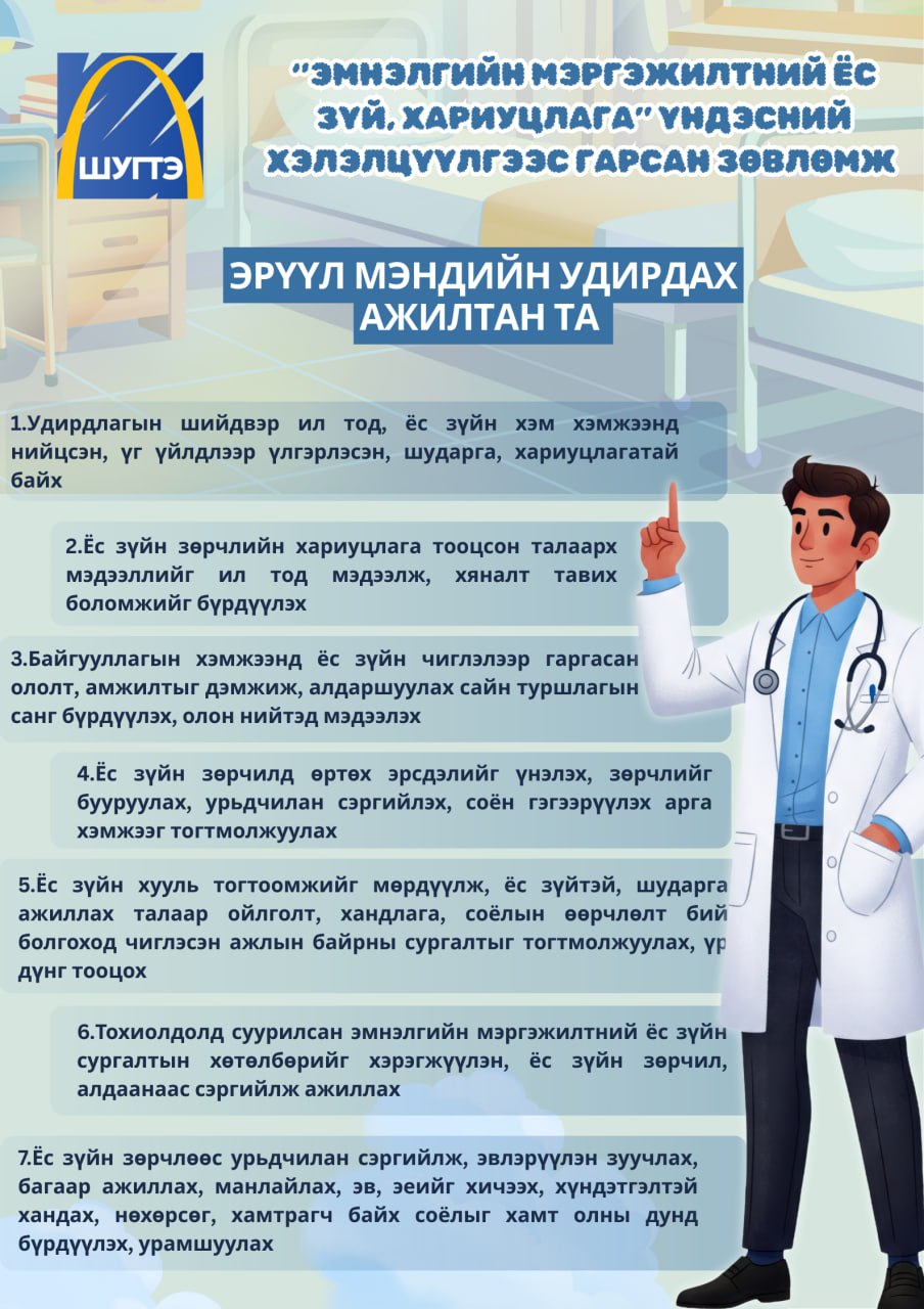 ЭМНЭЛГИЙН МЭРГЭЖИЛТНИЙ ЁС ЗҮЙ, ХАРИУЦЛАГА” ҮНДЭСНИЙ ХЭЛЭЛЦҮҮЛГЭЭС ГАРСАН УРИАЛГА, ЗӨВЛӨМЖ